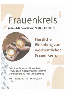 Bitte beachten: In den Monaten Juli und August der Ferienzeit macht auch das Treffen des Frauenkreises Ferien. Wir freuen uns, Sie im September.wieder begrüßen zu können.